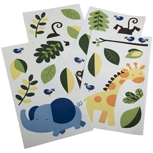 The Jungle 123 Nursery Wall Decals options four sheets of removeable and repositionable wall décor stickers with monkeys, giraffes, elephants and jungle leaf accents.
