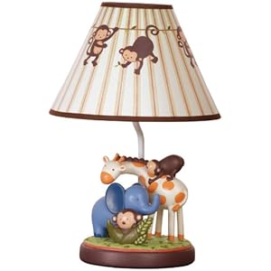 The Jungle 123 Nursery Lamp and Shade Set features a jungle animal design theme with accents of elephants, giraffes and monkeys and a coordinating stripe lampshade.
